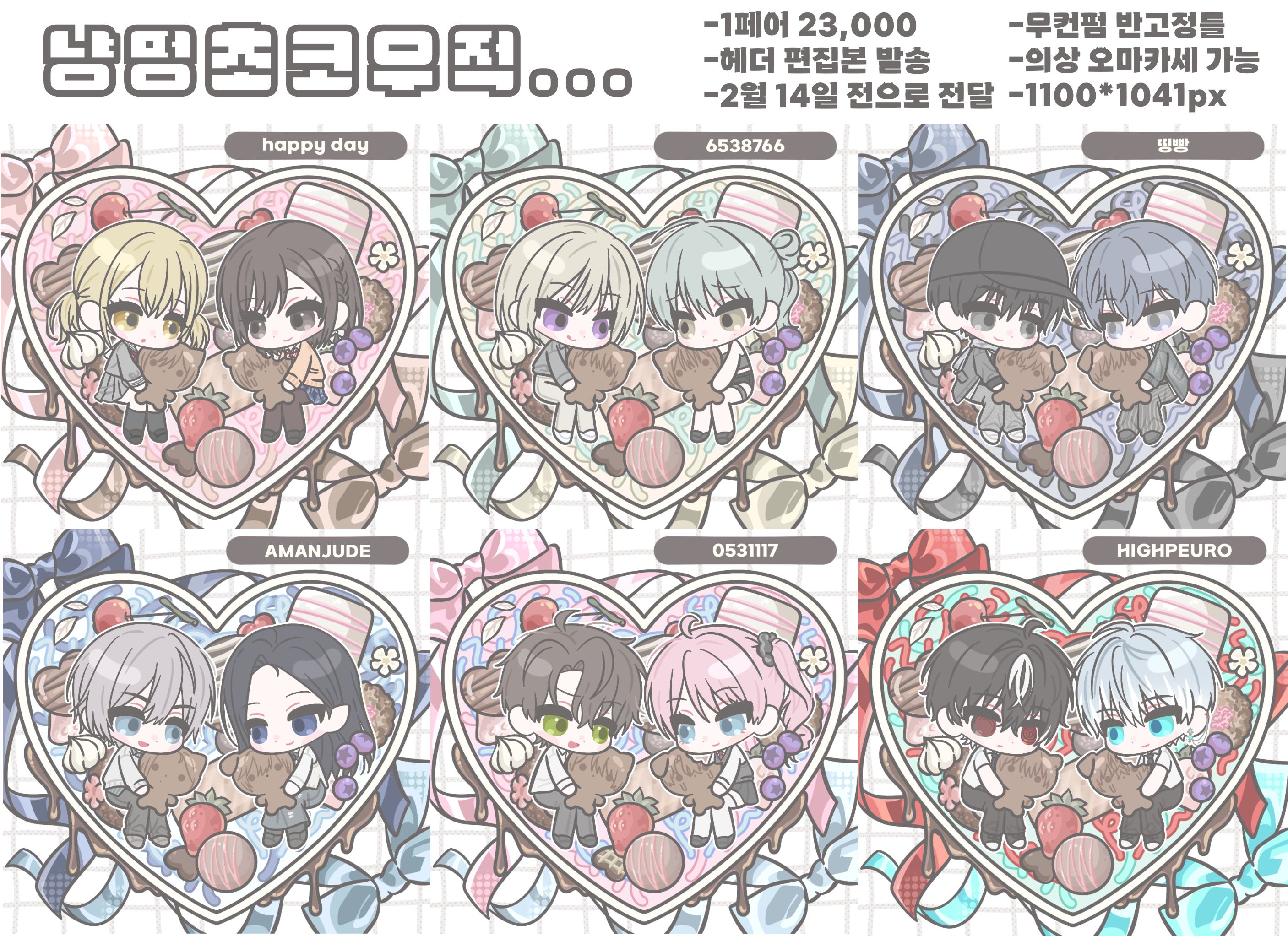 펜 선과 캐릭터 그리는 방식을 바꾸었습니다>< 예전 신청자분들이 같은 페어로 새 버전 신청해주시고 기타사항에 이전 버전 작업물 첨부해주시면 작은 서비스 그림을 끼워드립니다🤍